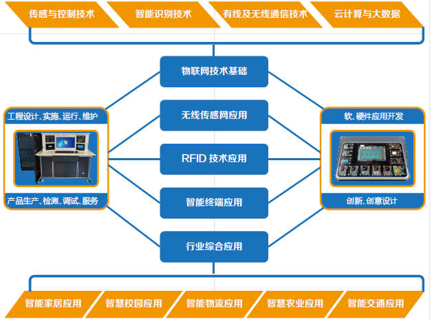 傳感與控制技術(shù)、智能識(shí)別技術(shù)、有線及無線通信技術(shù)、云計(jì)算與大數(shù)據(jù)、智能家居應(yīng)用、智慧校園應(yīng)用、智慧校園應(yīng)用、智慧農(nóng)業(yè)應(yīng)用、智能交通應(yīng)用